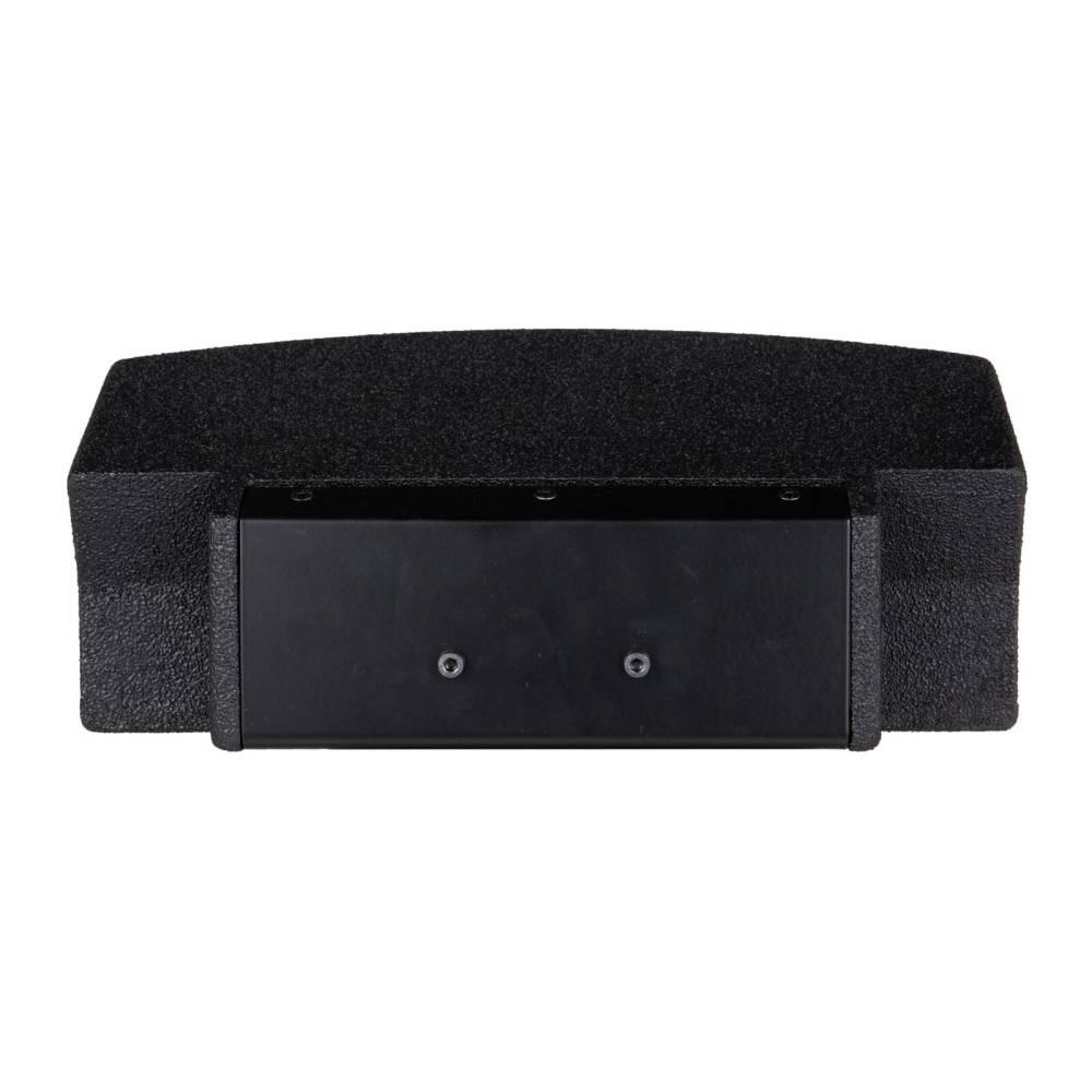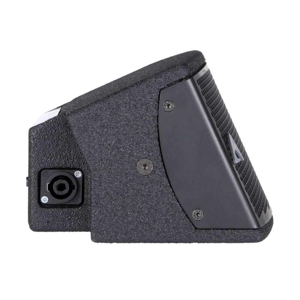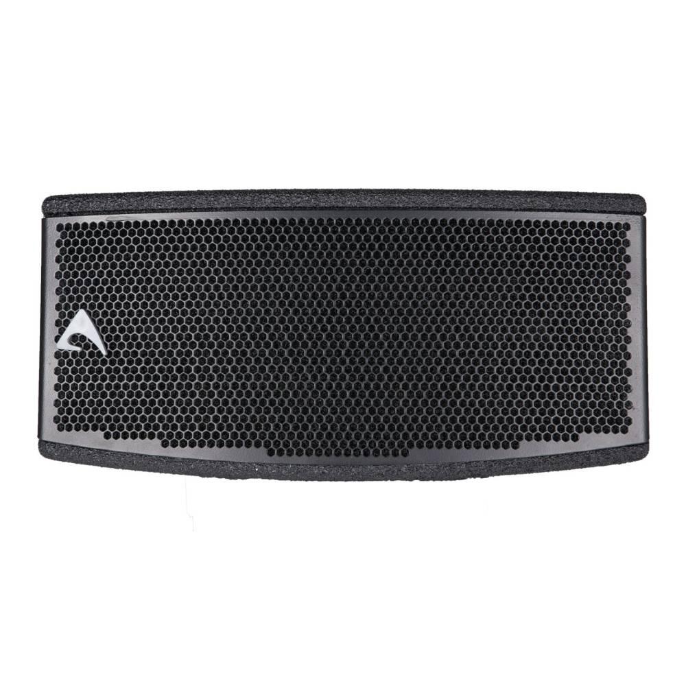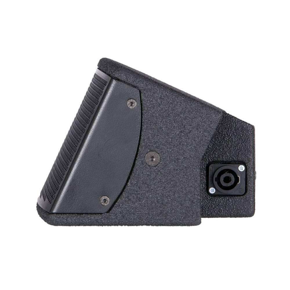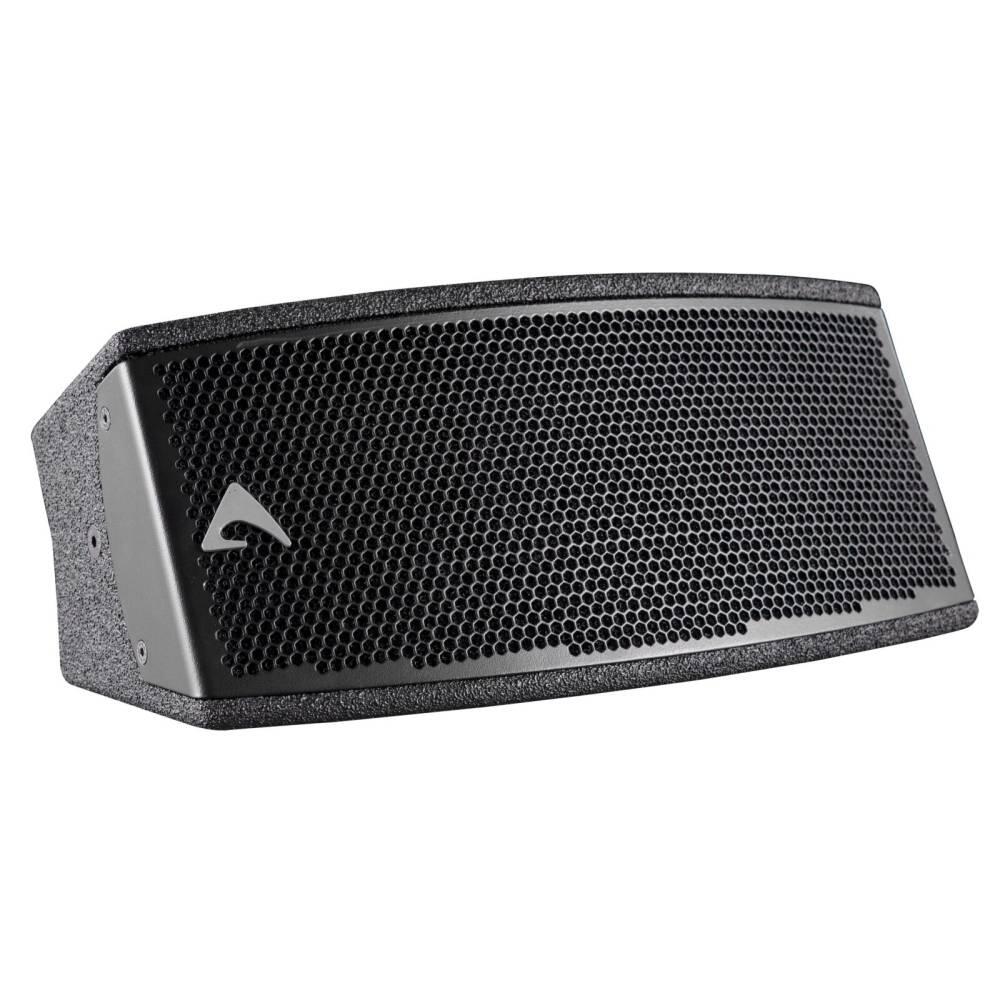 The cabinet is trapezoidally shaped, and also asymmetrical, and this profile not only allows the assembly of small clusters using the integral flypoints, but also enables it to be suspended horizontally very close to a ceiling or placed on a stage front as a low profile monitor.