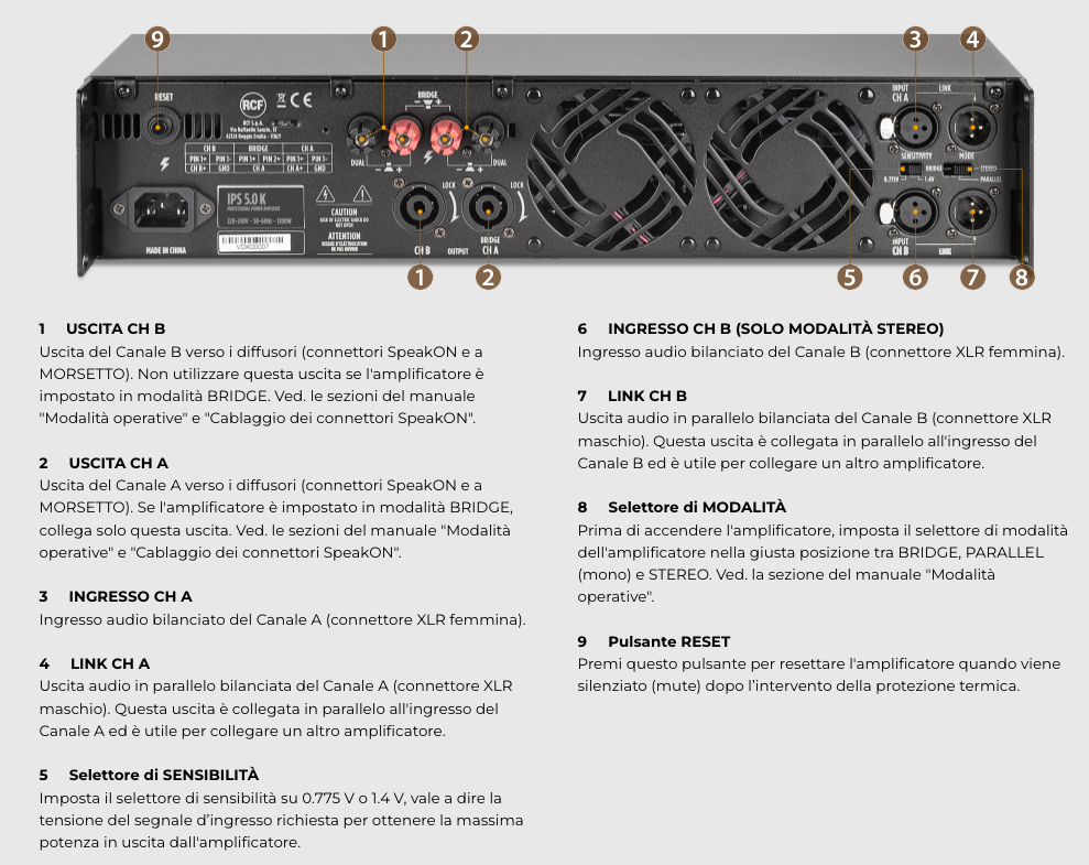 • Indicatori LED: segnale, clip, protezione/fault per ogni canale