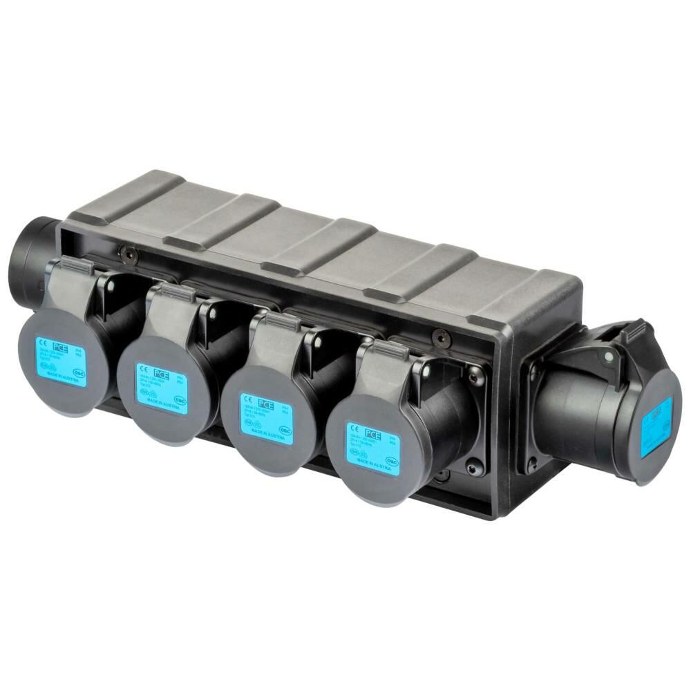 Box di distribuzione elettrica a 4 canali con ingresso spina CEE 16A - 2P+T - IP44 - 230V / uscita 4 x presa CEE 16A -2P+T - IP44 - 230V e rilancio su presa CEE 16A - 2P+T - IP44 - 230V. Carico massimo applicabile 16A.