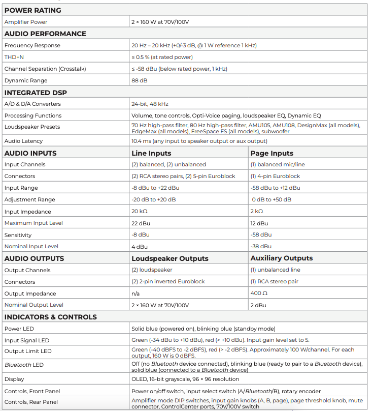 Amplificatore serie Veritas 2×160W 70/100V – Ingresso wireless Bluetooth® 5.0 e il pratico display OLED