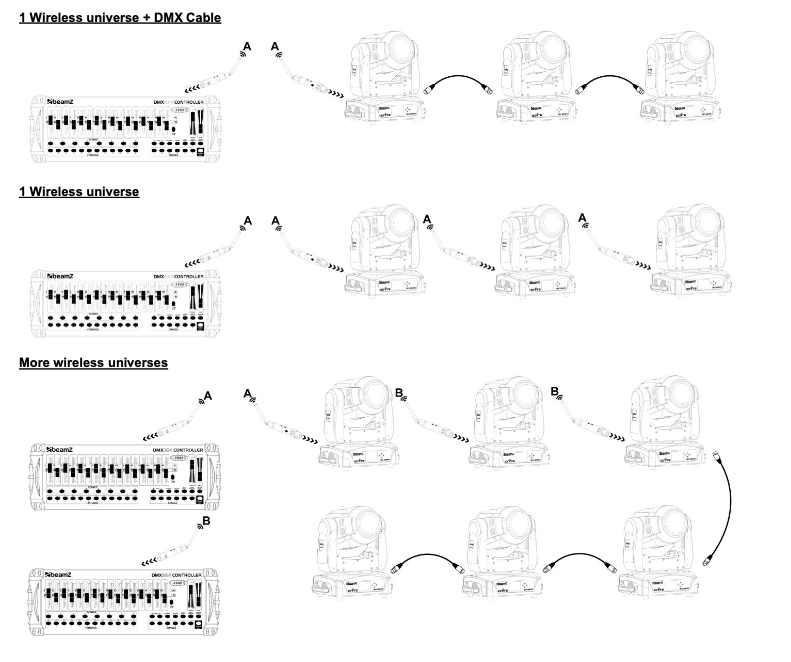 Un trasmettitore / ricevitore DMX wireless compatto in grado di controllare fino a 7 universi.