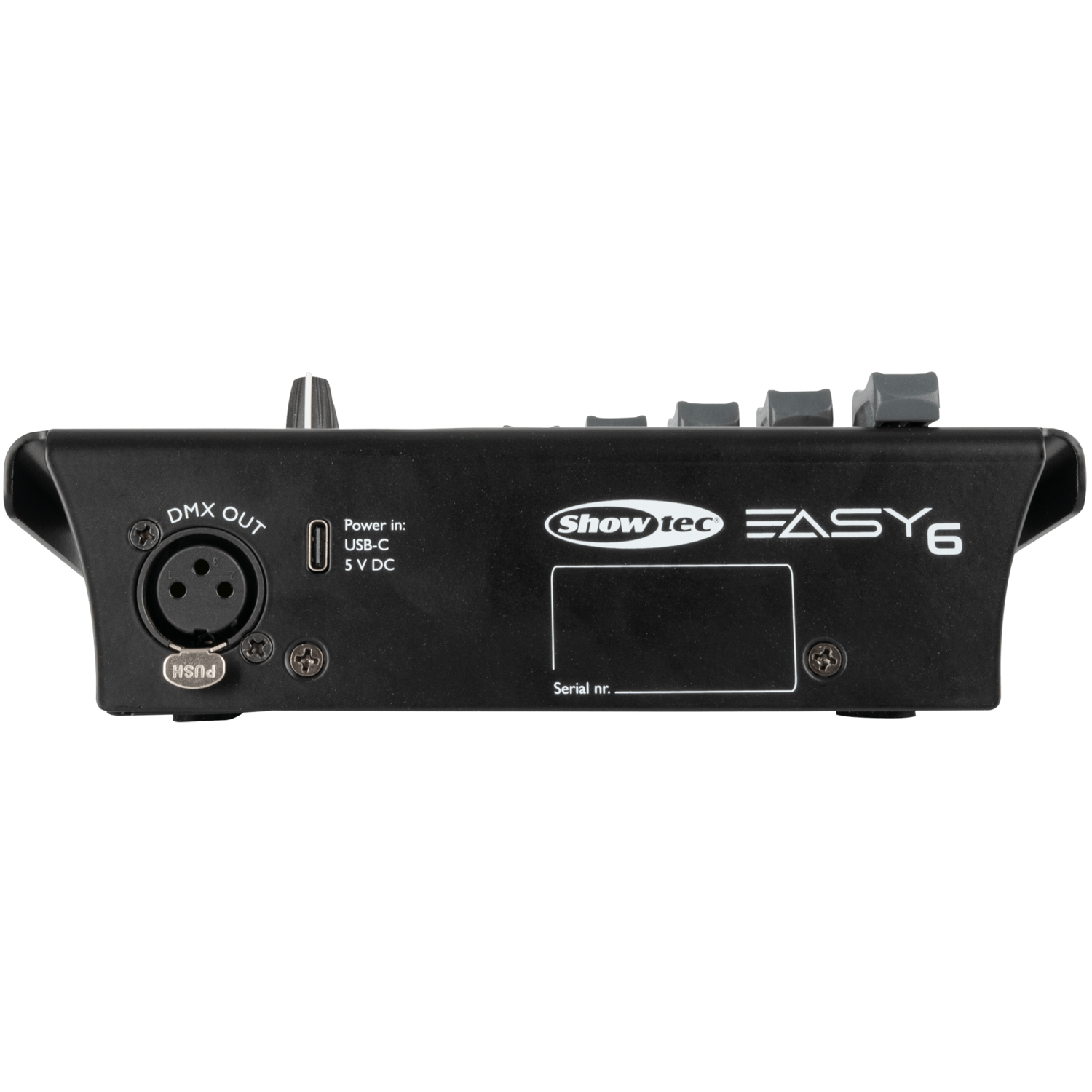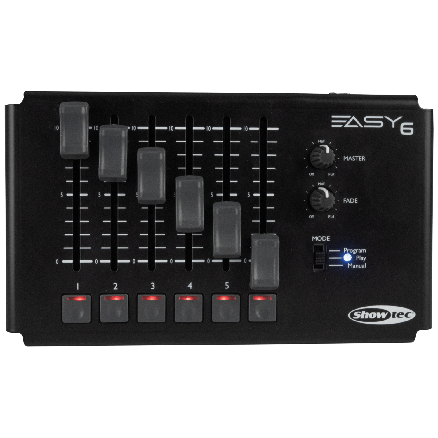 ​Showtec Easy 6 è un controller DMX compatto a 6 canali con 6 fader, 6 pulsanti con LED integrati, un pulsante della modalità, una manopola di dissolvenza rotante e una manopola dimmer master.