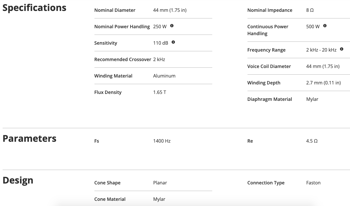 L'ultimo nato in casa Ciare per la linea "Competition" è perfetto per sistemi a 2 o 3 vie dove si richiede una sezione acuti dominante e definita. Si raccomanda un filtraggio adeguato (frequenza di taglio consigliata sopra i 5 kHz) per massimizzarne le prestazioni e la durata.