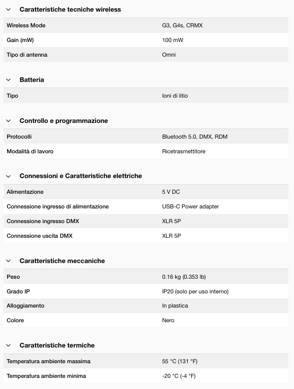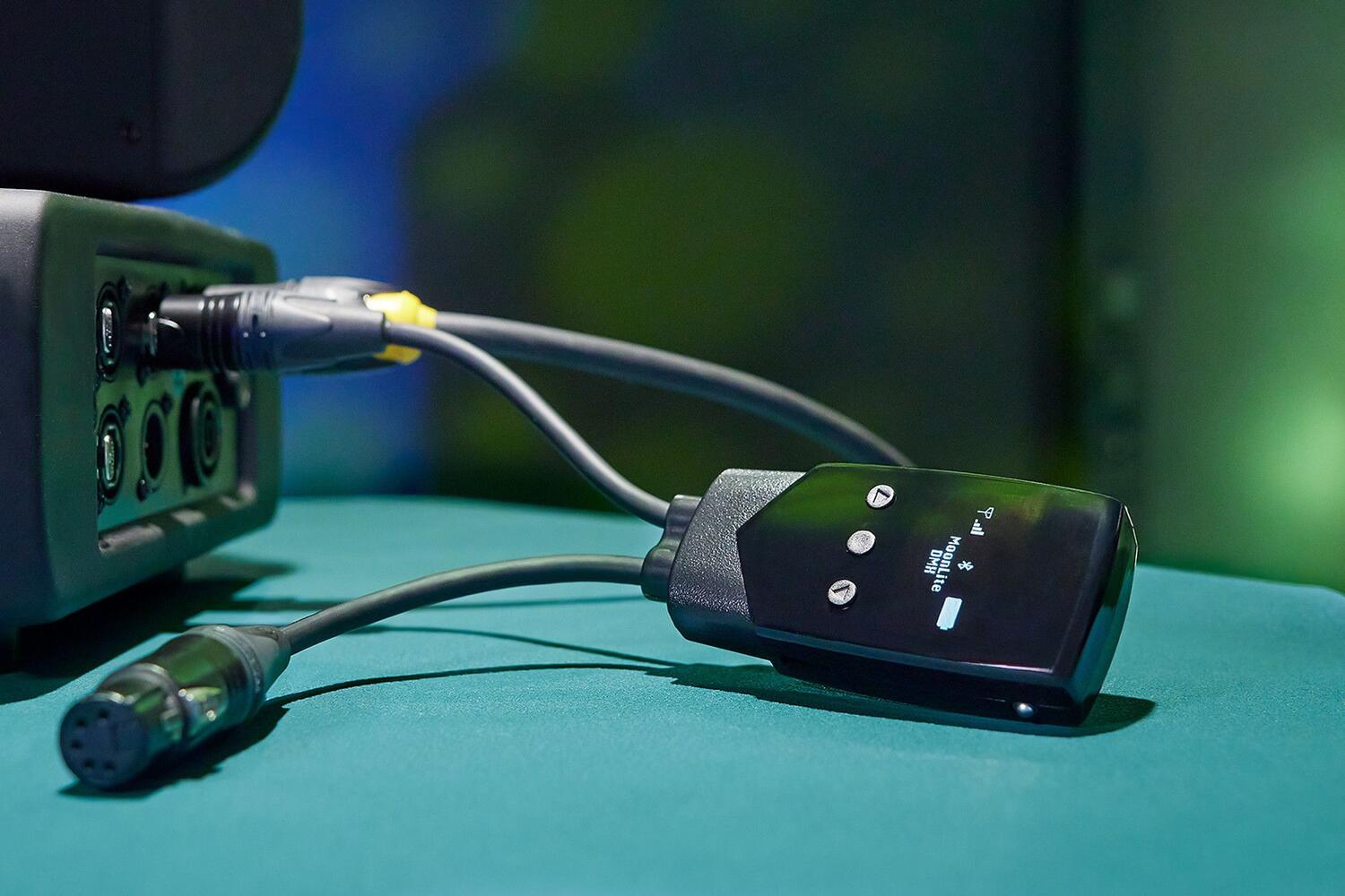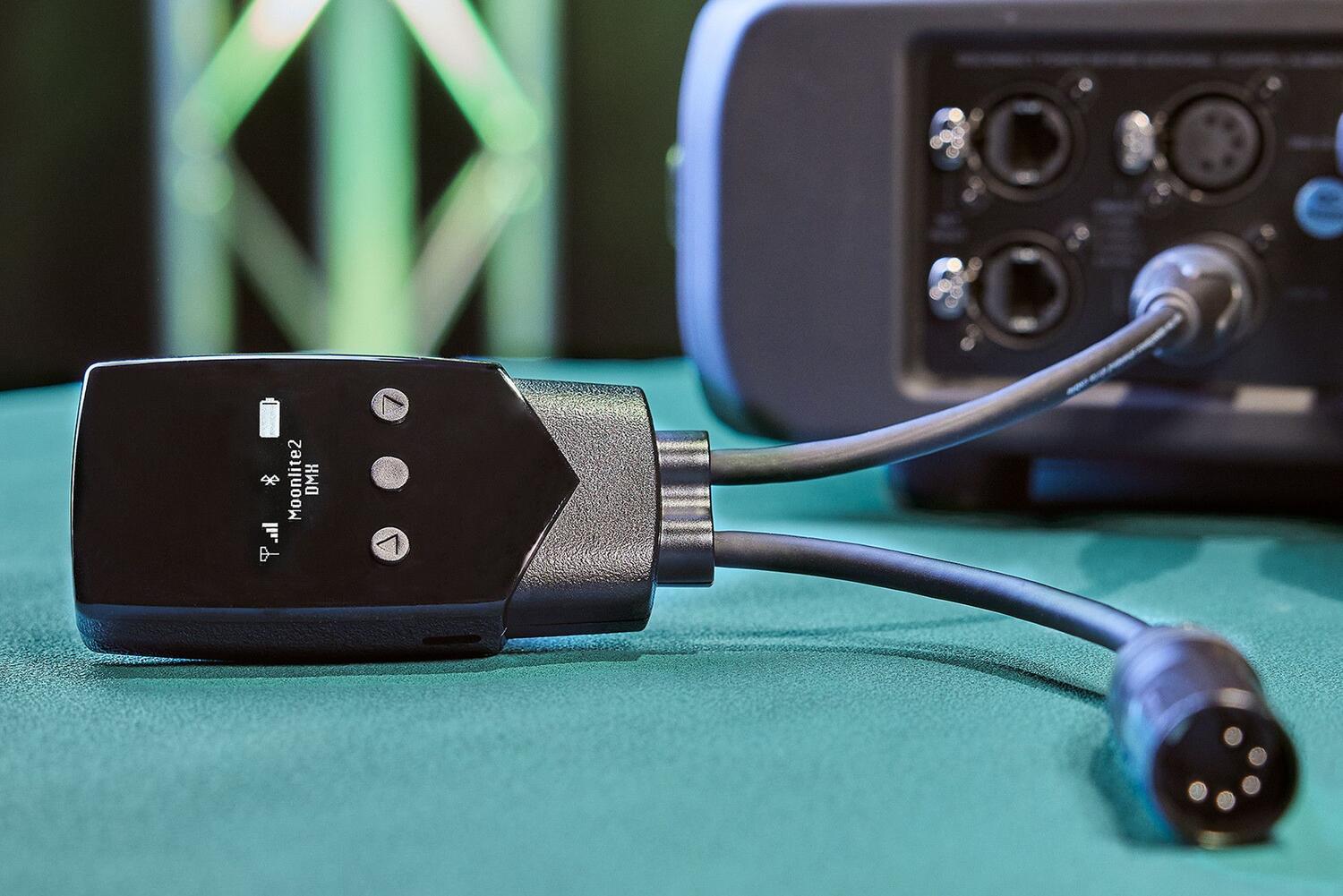 Il MoonLite² di Lumenradio è un ricetrasmettitore CRMX portatile e alimentato a batteria che può essere collegato direttamente alla porta DMX della lampada, offrendo una funzionalità wireless immediata.