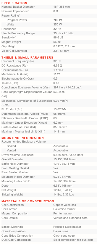 Eminence Legend BP1525 è un altoparlante da 15″ (381 mm) progettato per bassisti e professionisti dell’audio che cercano un suono caldo, ricco e profondo. Con impedenza di 8 Ω, potenza nominale di 350 W RMS (700 W di programma) e risposta dai 35 Hz fino a 2,1 kHz, è perfetto per cabinet bass-reflex o chiusi, sistemi PA e installazioni professionali.