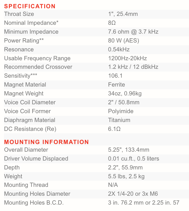 Frequenza di crossover raccomandata: 1,2 kHz (filtro 12 dB/ott)