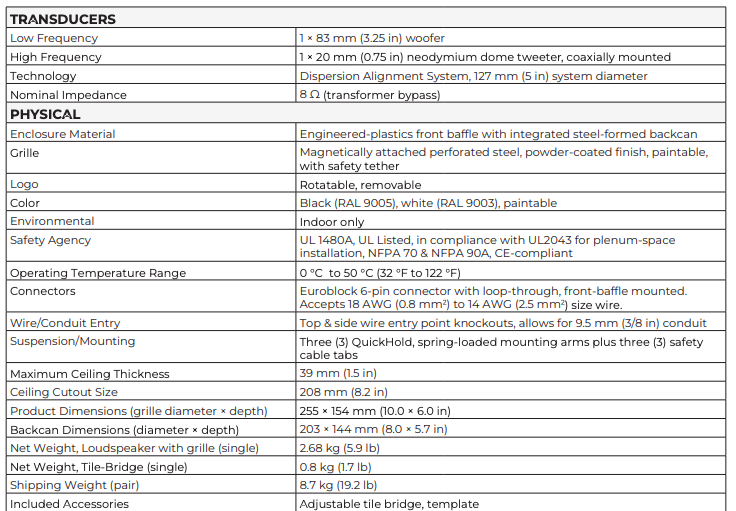 Il DM3C è dotato di un woofer a due vie da 3,5 pollici e di un tweeter coassiale da 0,75 pollici montati all'interno del sistema Dispersion Alignment, che offre una gamma di frequenza da 75 Hz a 20 kHz.