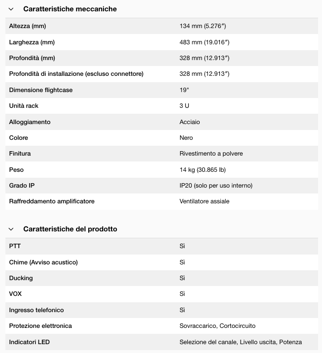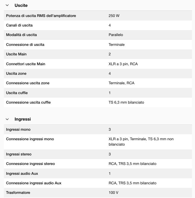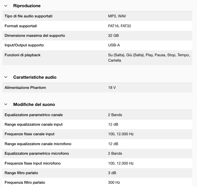 I 3 ingressi microfono/linea sono dotati di alimentazione phantom +48 V e permettono di scegliere tra 8 sorgenti audio, tra cui un lettore USB integrato e due ingressi USB (anteriore e posteriore) e un sintonizzatore FM/DAB+ da cui è possibile memorizzare fino a 10 stazioni audio.