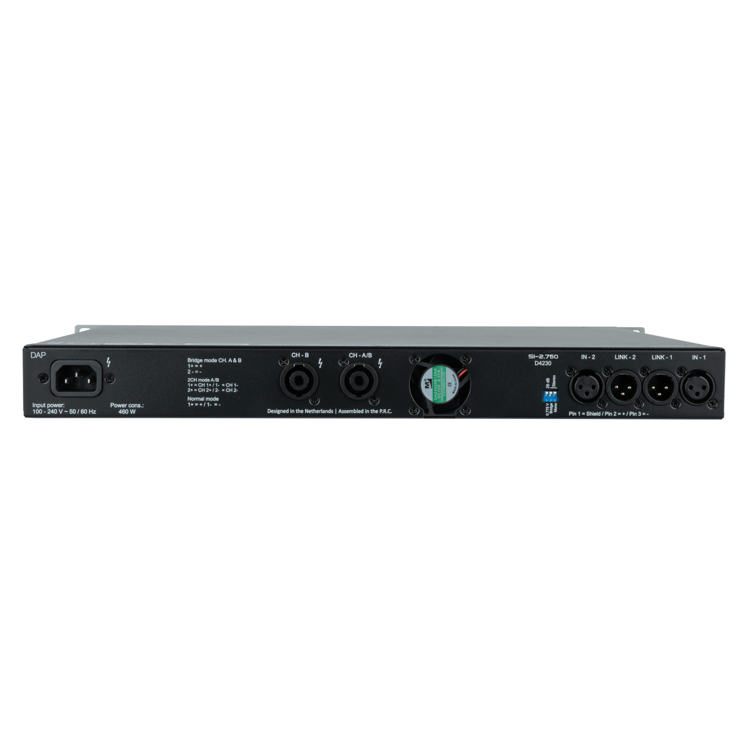 Il DAP SI-2.750 è un amplificatore digitale compatto in formato 1U progettato per impianti fissi, installazioni audio professionali e contesti che richiedono prestazioni elevate in uno chassis leggero. Offre modalità operative flessibili (stereo, bridge, mono, parallelo), stabilità operativa fino a 2 Ω e una potenza fino a 750 W per canale. Con alimentazione switching universale (SMPS), è perfetto per applicazioni che richiedono alta potenza e compattezza.