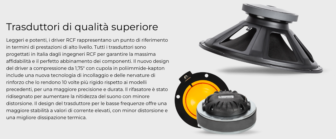 La combinazione tra un driver a compressione da 1,75", un woofer da 12", un amplificatore a 2-canali da 2100 W e una guida d'onda a direttività costante produce una copertura di 100° x 60° coerente sull’intera zona d’ascolto e un suono privo di distorsione per livelli di pressione sonora fino a 130 dB SPL.