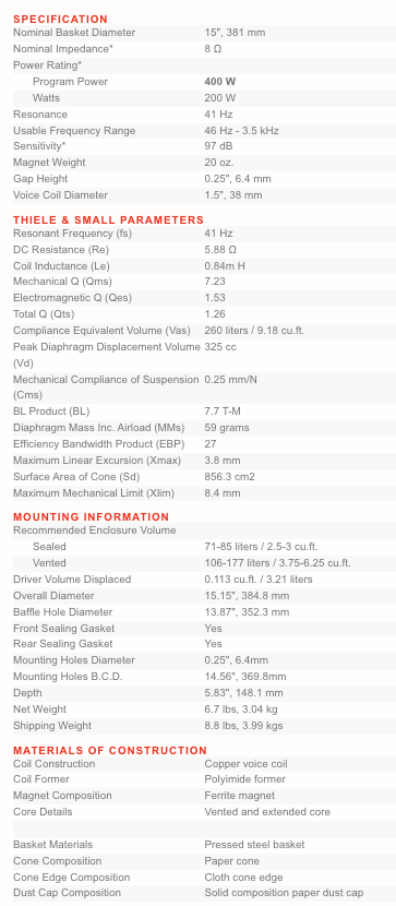 Woofer 15", 200W, 8Ω. Per pro-audio e amplificazione del basso