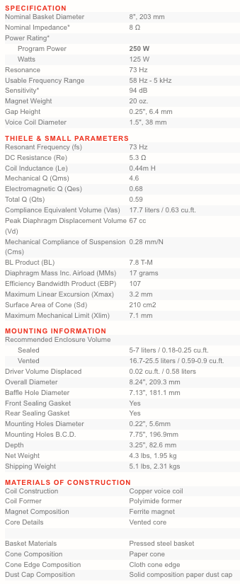 Woofer / Mid-bass 8", 125W RMS, 8Ω