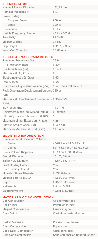 Eminence Beta 15A è un woofer professionale da 15″ (381 mm) progettato per applicazioni PA e mid-bass ad alta efficienza. Con impedenza 8 Ω, potenza gestita fino a 300 W RMS (600 W programma) e sensibilità di circa 98 dB, offre prestazioni solide per cabinet chiusi o reflex, garantendo bassi profondi e un’estesa risposta in frequenza.