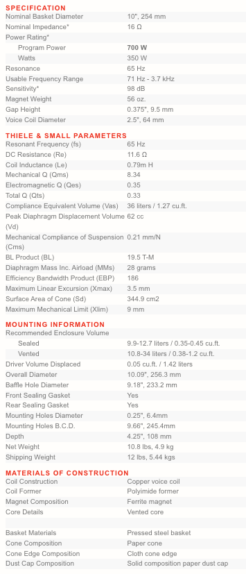 Applicazioni consigliate: mid-bass in sistemi PA, monitor da palco, cabinet per basso e keyboard
