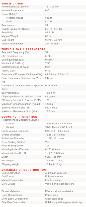 Applicazioni consigliate: mid-bass o full-range in sistemi PA, cabinet 1×12″/2×12″, monitor da palco