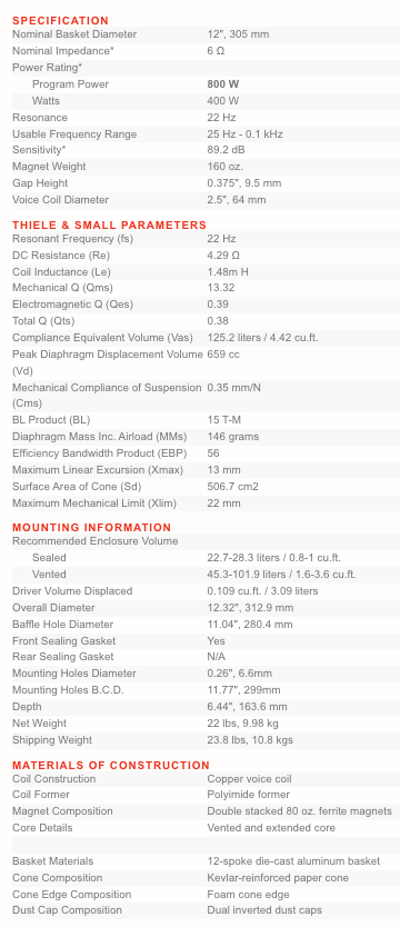 Consigliato per cabinet audio professionali ventilati, sigillati e caricati a tromba come subwoofer. Ottimo anche come sub automobilistico.