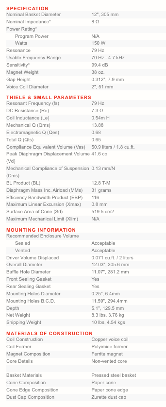 • Applicazioni consigliate: Cabinet per chitarra 1x12, 2x12 e 4x12, combo amplificatori, suoni rock, blues, southern rock e hard rock classico