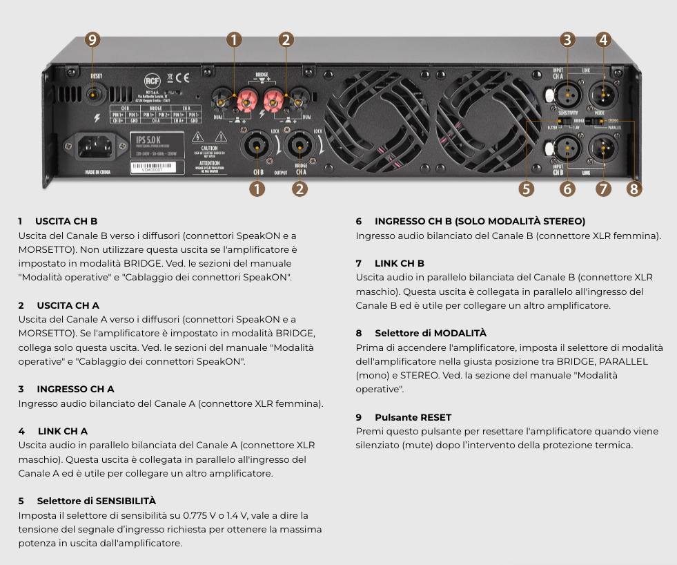 • Uscite: speakON e morsetti a vite (binding posts)