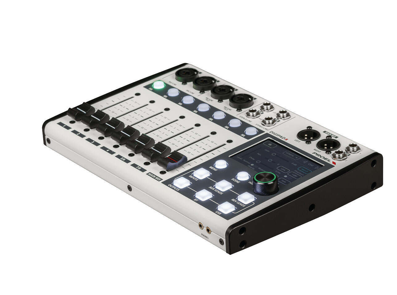 Disegnato per un utilizzo stand-alone DIGIPAD 8 permette di controllare tutte le funzionalità direttamente dal display touch screen, senza rinunciare, nel contempo, alla possibilità di gestire l’intero mix dal proprio smartphone o tablet grazie all’app dedicata per Android e iOS.