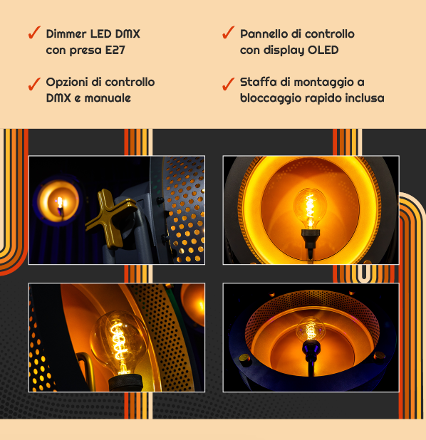 Composto da un'elegante base e un attacco E27 adatto a una lampadina LED di design, il dimmer integrato supporta sia il funzionamento in DMX sia quello manuale, offrendo semplici opzioni di controllo.