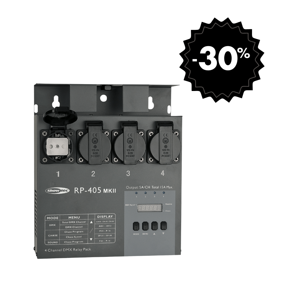 Il dispositivo Showtec RP-405 è uno relé-pack con relé integrati particolarmente adatto per gli effetti luce LED.