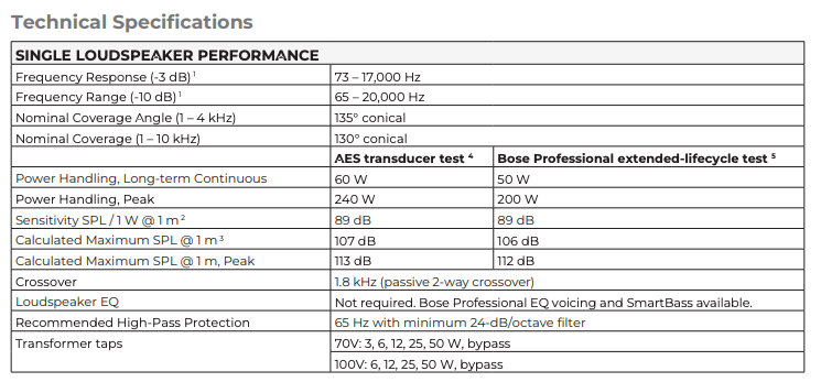 Goditi bassi potenti e alti chiari e intelligibili grazie ai driver coassiali a due vie — senza bisogno di DSP o EQ. Per prestazioni ancora migliori, è possibile utilizzare DSP e amplificatori Bose Professional selezionati, che abilitano l’equalizzazione dei diffusori e la tecnologia SmartBass, ampliando resa e risposta a qualsiasi livello di ascolto.