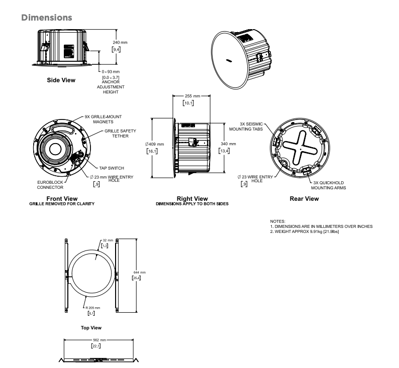 Installazione facilitata con accessori standard di settore: tutti i modelli includono connettori Euroblock; le versioni da incasso a soffitto sono fornite di box posteriore omologato per controsoffitti (plenum-rated), supporti per pannelli e cablaggio frontale che agevola sia l’installazione che la manutenzione.