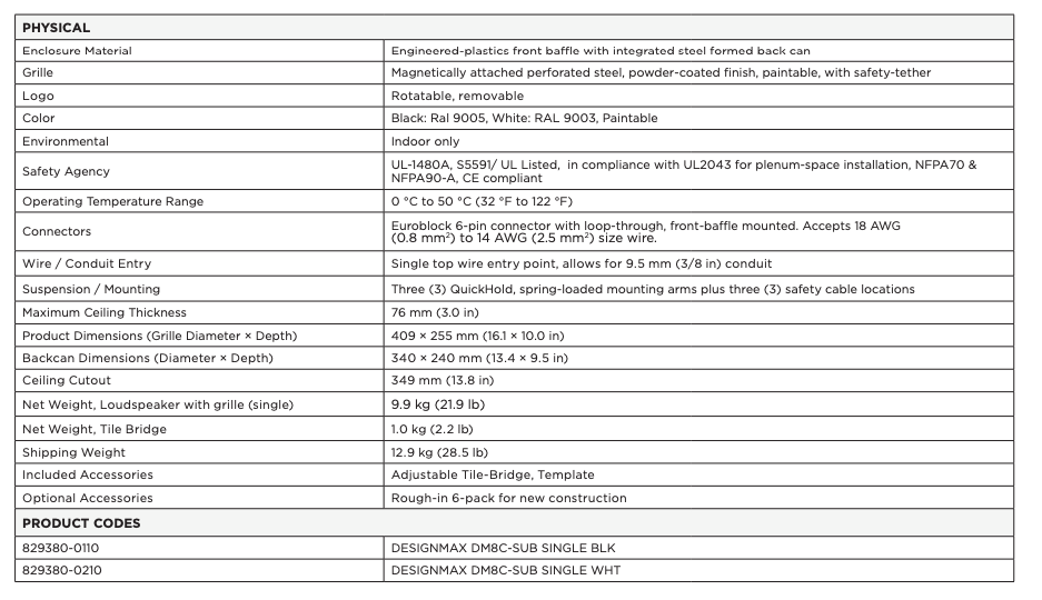 Il modello DM8C-SUB da incasso a soffitto è dotato di un woofer da 8 pollici, con una gamma di frequenze da 38 Hz a 155 Hz, e si installa facilmente grazie ai bracci di montaggio QuickHold.