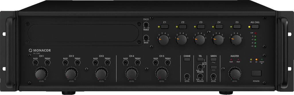 Monacor PA-1240 è un amplificatore mixer monofonico progettato per la gestione audio professionale in ambienti complessi.