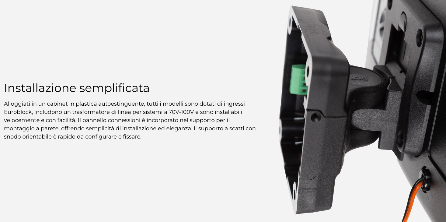 L’installazione risulta molto semplice grazie alla scheda connessioni integrata nel supporto per il montaggio a parete (fornito in dotazione), che consente all’installatore di impostare l’inclinazione desiderata, di fissare il diffusore e infine di collegarlo rapidamente senza bisogno di alcun utensile.