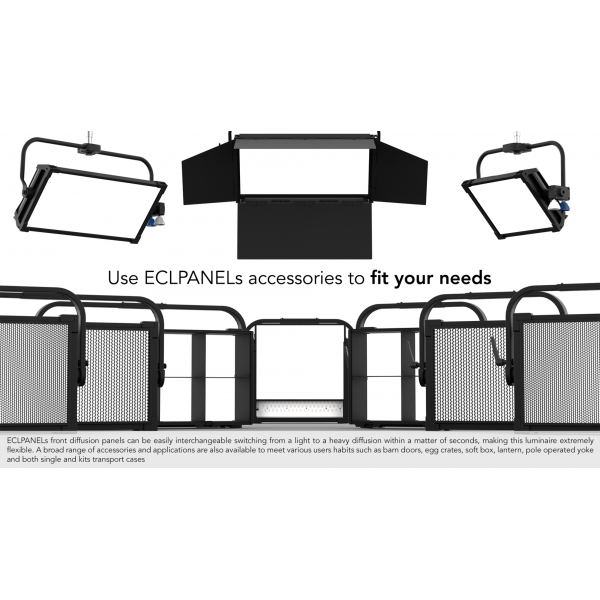 Il proiettore è progettato con alimentatore e driver di controllo integrato nell'housing , e la sua semplicità d'uso rende EclPanel un illuminatore ideale per applicazioni in Studio, Cinema o Corporate.