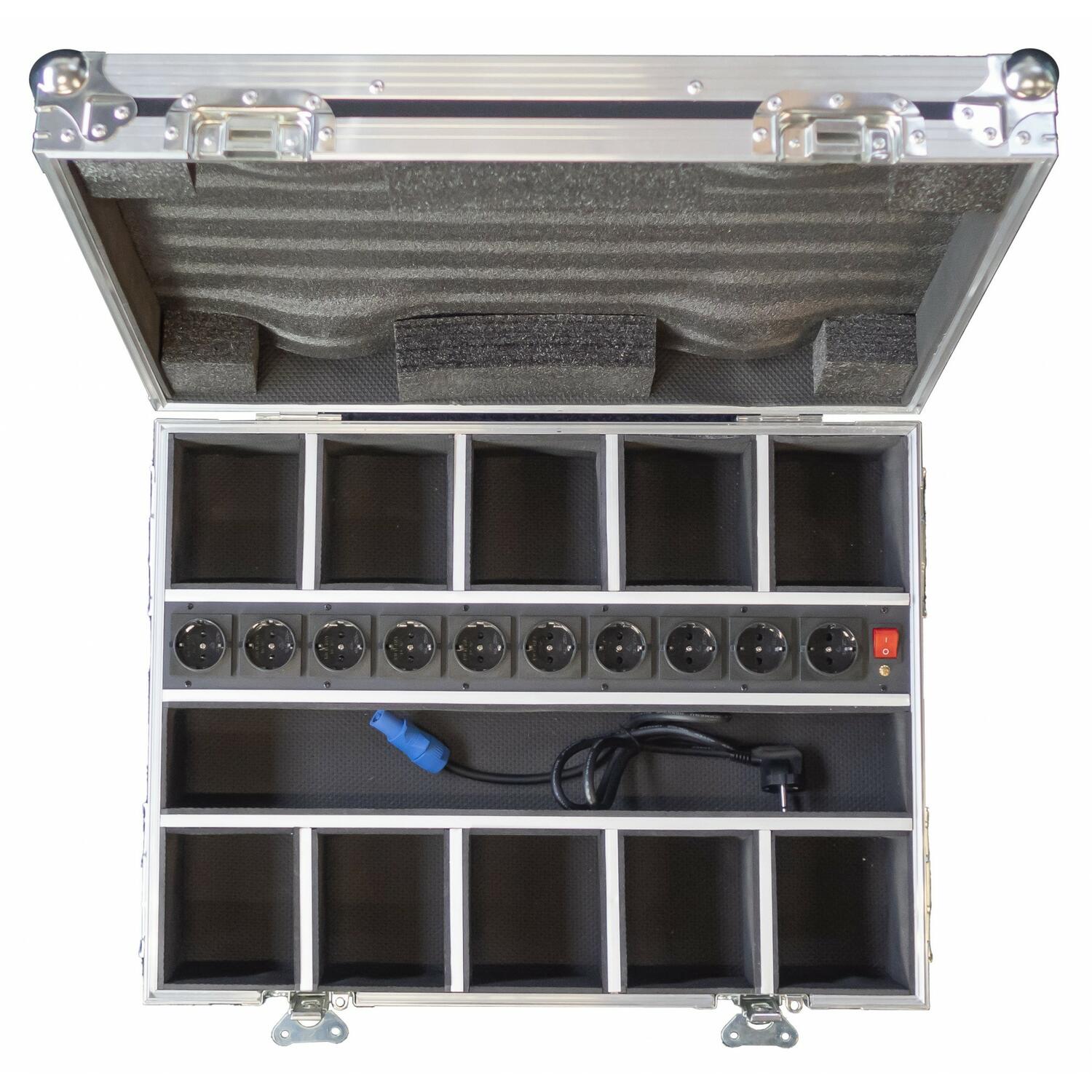 più flightcase uno sull'altro in maniera semplice evitando cadute accidentali - Circuito di ricarica integrato per 10 fari