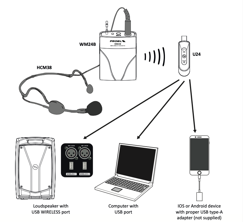 Infine, può essere collegato ad qualunque apparato Proel dotato di ingresso USB wireless (come , ad esempio, i diffusori V FREE e V WAVE) per utilizzare un microfono wireless professionale immediatamente e senza l'ingombro di cavi.