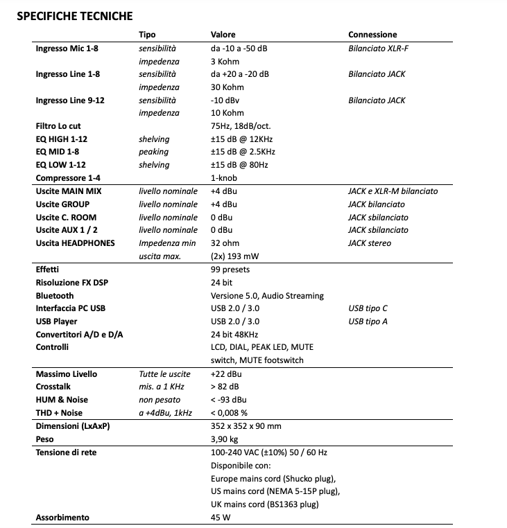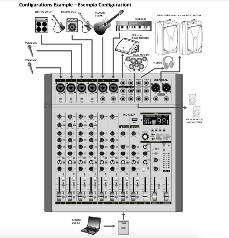 MQ1222X offre 12 ingressi totali, inclusi 6 preamplificatori microfonici di alta qualità che garantiscono un suono cristallino e trasparente.