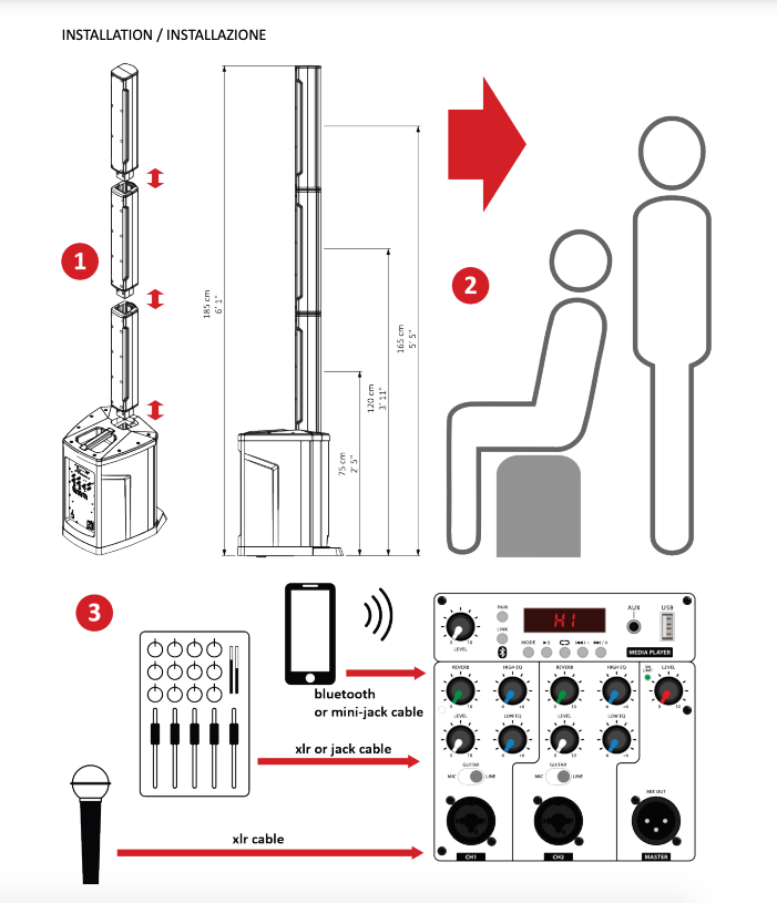 Alloggiato in cabinet in polipropilene ultraleggeri ma estremamente resistenti, il sistema è dotato di una colonna con quattro altoparlanti full-range da 2,5" ad alta definizione abbinati a un subwoofer da 8" profondo e potente.