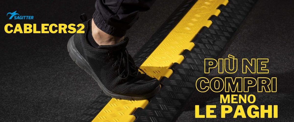 Il pannello di chiusura in PVC di colore giallo è dotato di una efficace texture antiscivolo connessa alla pedana tramite una utile cerniera di giunzione studiata per installare o ispezionare in modo rapido le conduttore sottostanti.